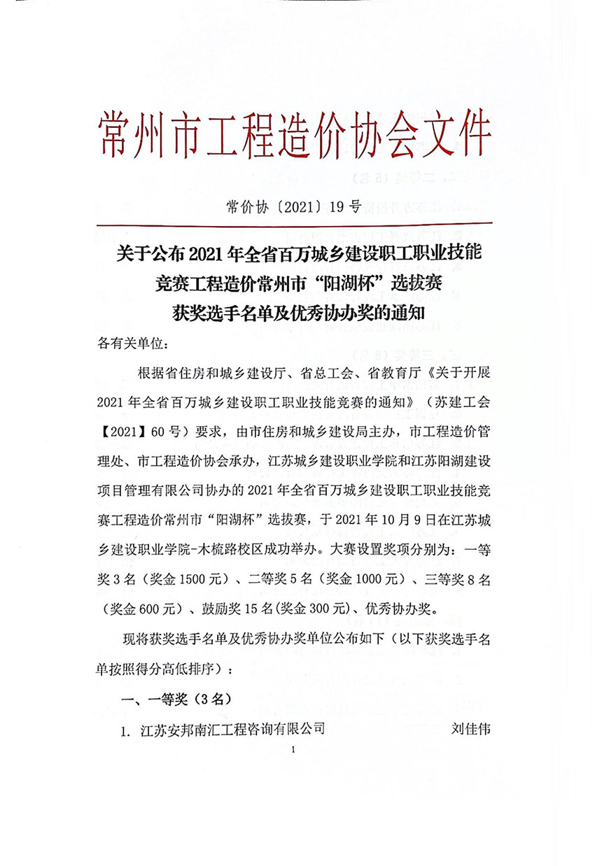 祝贺我司刘佳伟在2021年省职业技能竞赛常州市“阳湖杯”选拔赛中荣获一等奖!
